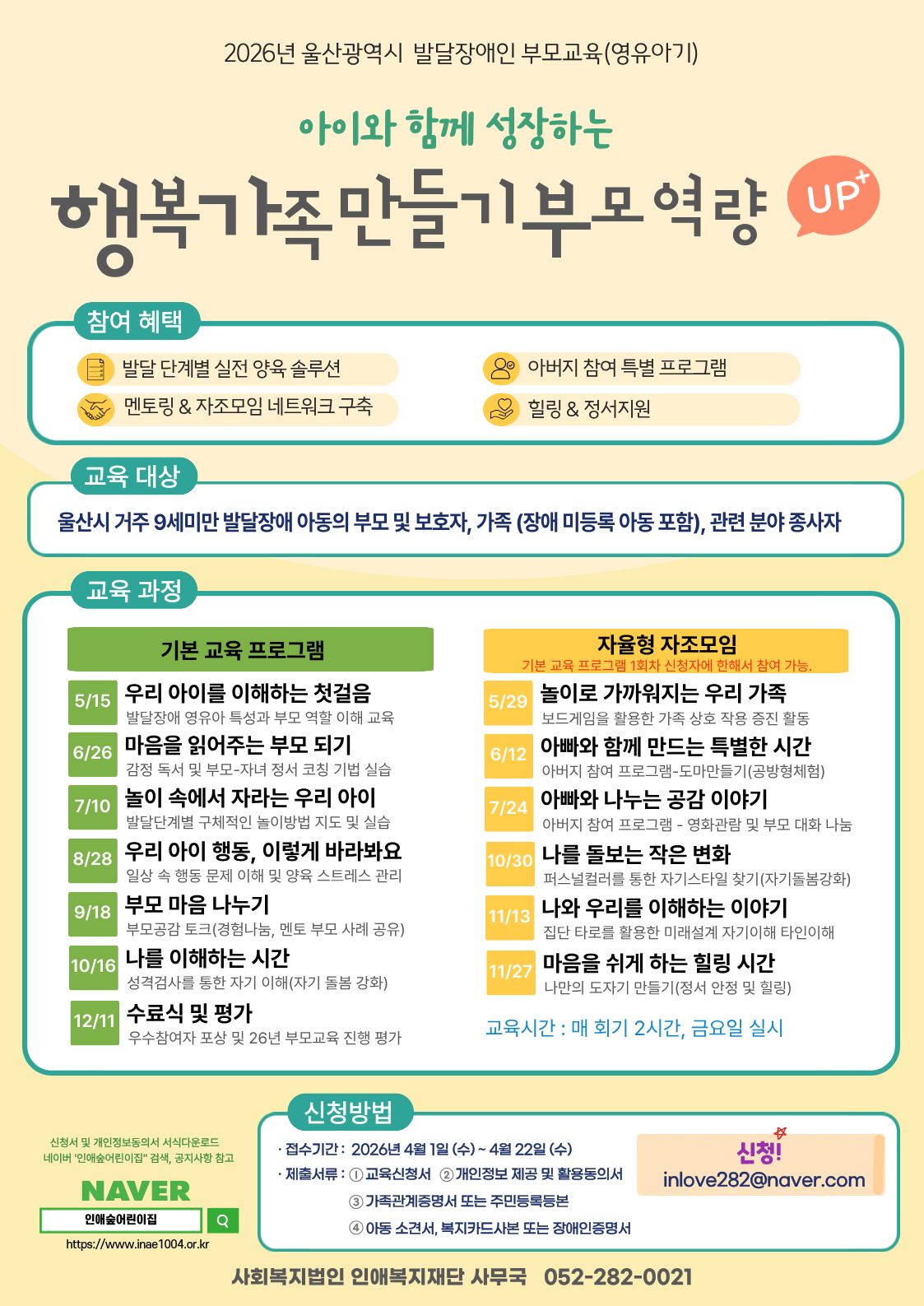 사회복지법인 인애복지재단은「발달장애인 권리보장 및 지원에 관한 법률」에 근거 2026년 발달장애인 부모교육지원 사업을 위하여 울산시 거주 발달장애자녀를 둔 가족을 대상으로 발달장애 전문정보 및 양육기술 제공과 발달장애인 부모교육프로그램을 통해 서로 간의 소통 및 가족관계 향상을 돕기 위해 교육을 진행하고자 합니다.
