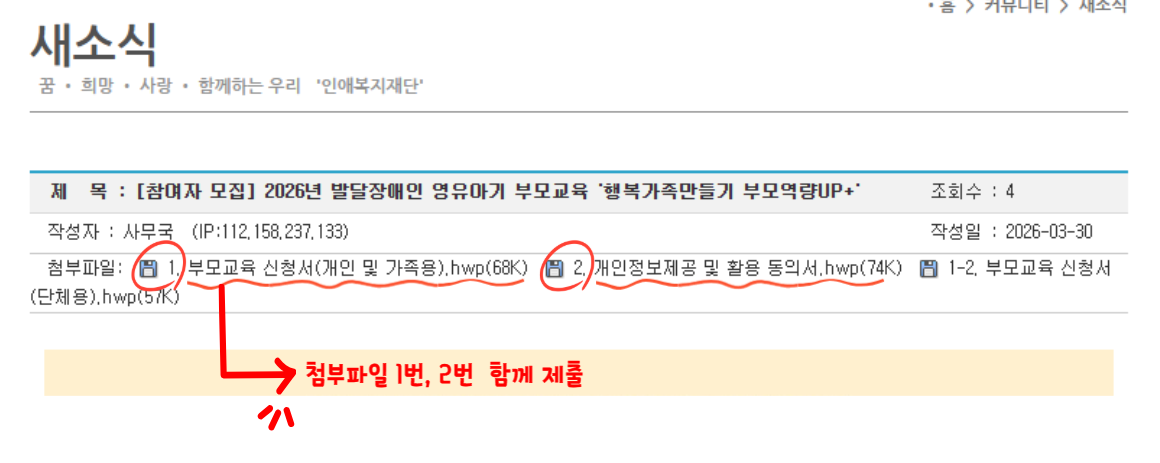 | 제 목 : [참여자 모집] 2026년 발달장애인 영유아기 부모교육 '행복가족만들기 부모역량UP+' | 조회수 : 111 |