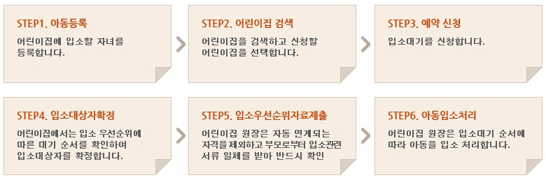 - [온라인신청시] 부모 또는 보호자가 임신육아종합포털 아이사랑(www.childcare.go.kr)에 접속하여 입소신청 - [어린이집방문시] 부모 또는 보호자가 어린이집을 방문하여 입소신청